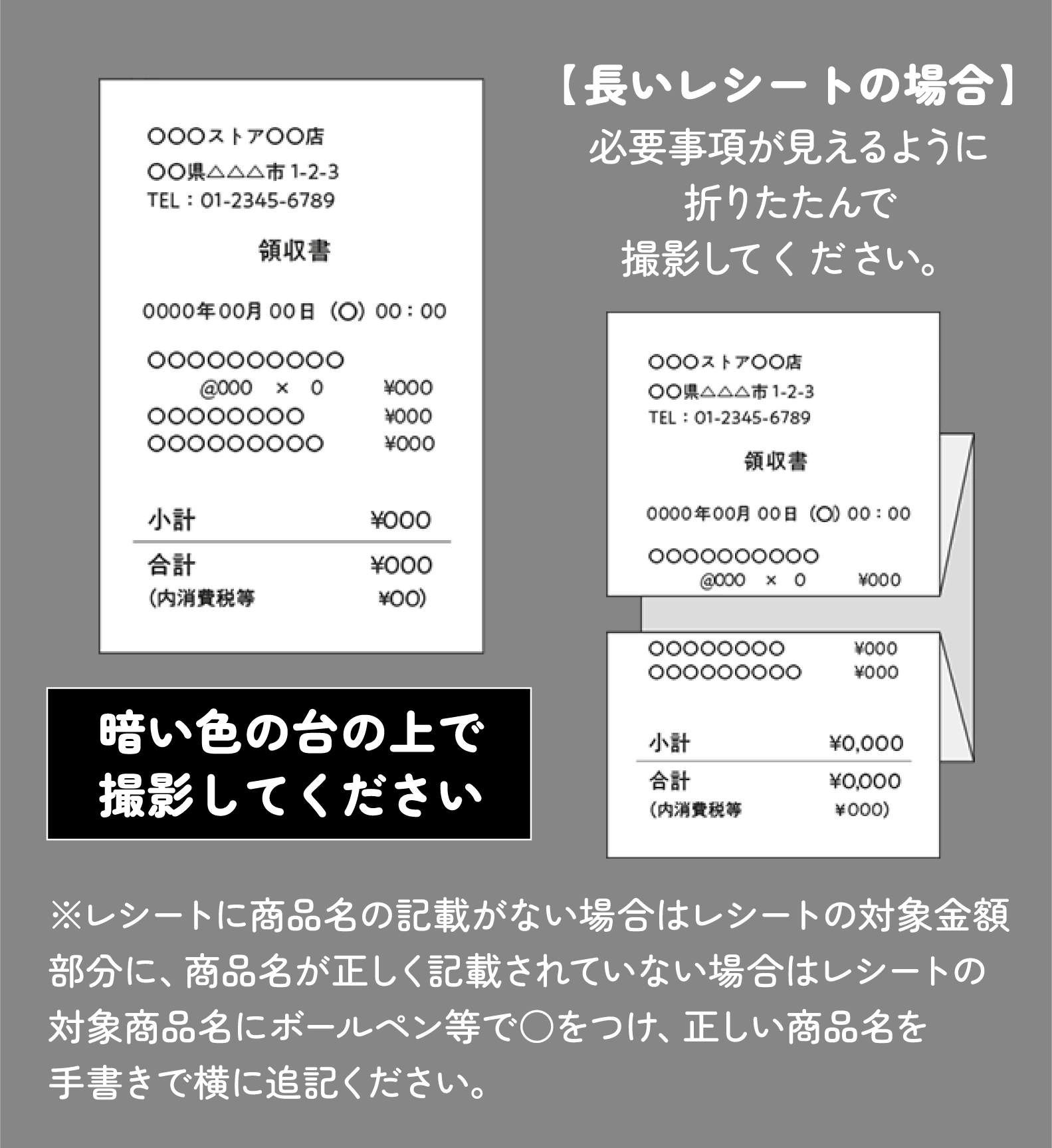 ただし、1つの画像で複数枚のレシートを撮影する場合は、全てのレシートの内容(必要事項など)がしっかり見えるように撮影してください。