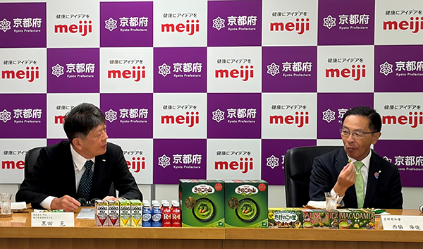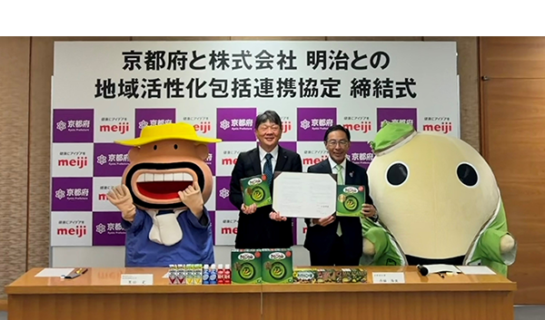 株式会社 明治(代表取締役社長:八尾 文二郎)は、当社の商品や食育活動を通じて、京都府(知事:西脇 隆俊)のさらなる地域活性化を図るため、2025年9月29日(月)に京都府と「地域活性化包括連携協定」を締結しました。締結式当日は、経路限定※1で9月30日(火)に発売予定の「きのこの山宇治抹茶ギフト」と、締結を記念して作成した、西陣織とカカオハスク※2を使用したオリジナルの証書ホルダーをお披露目しました。