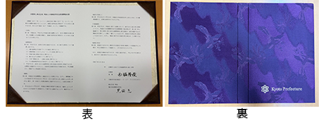 締結を記念して作成した、西陣織とカカオハスクを使用したオリジナルの証書ホルダーに協定書を収めました。