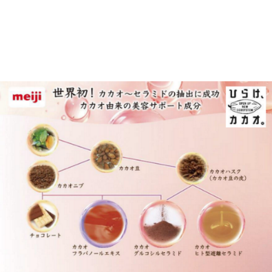 カカオの種皮より抽出した保湿成分で、 当社が世界で初めて素材化に成功しました。食品と化粧品両方への活用が期待でき、「カカオボーテ」ブランドとしてチョコレートやゼリーを販売するなど、今後も多様な展開を予定しています。