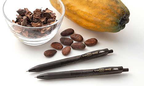 「カカオバイオプラスチック」は、当社と株式会社ヘミセルロースが共同開発した、カカオの種皮を配合した樹脂素材です。環境負荷の面では石油由来プラスチックと比較して、CO2排出量を30~60%削減することが可能で※2、物性の面では硬さと柔軟性を両立している点を特長としており、幅広い分野への展開が期待されています。すでに当社品「遊べる!学べる!サステナブルきのこの山」のトレーの材料に採用しており、玩具(株式会社タカラトミー「プラレール」)や筆記具(ゼブラ株式会社「サラサクリップ」)など※3にも使用されています。