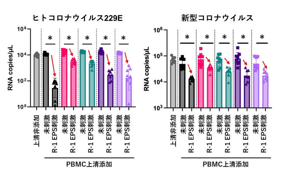 新型コロナウイルス感染症の感染拡大は、現在ワクチンおよび抗ウイルス薬の開発により制御可能な段階に入りましたが、さらなる変異株の出現に対する防御のためには、自然免疫を強化する感染防御策の開発が不可欠です。本研究では、免疫賦活効果を有することが報告されているR-1 EPSのコロナウイルスに対する増殖抑制作用を検討しました。