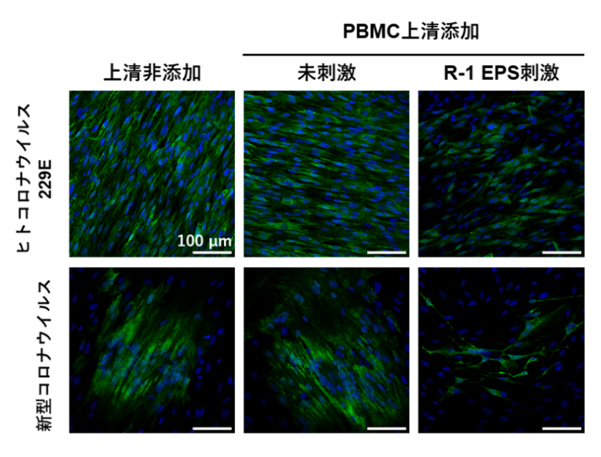 1. R-1 EPSで刺激したヒト末梢血単核細胞※3(以下、PBMC)の培養液をヒト肺由来培養細胞に加えて培養することで、ヒトコロナウイルス229E※4および新型コロナウイルスの増殖が抑制されました。