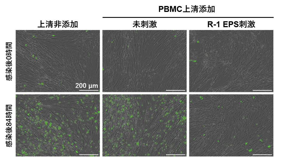 3. R-1 EPSで刺激したPBMCの培養上清の添加により、HCoV-229E感染後の細胞死が抑制されました(図3、動画)。