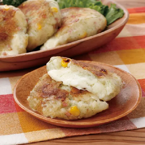 <2>モッツァレラを串に刺し、衣をつけパン粉をまぶす。