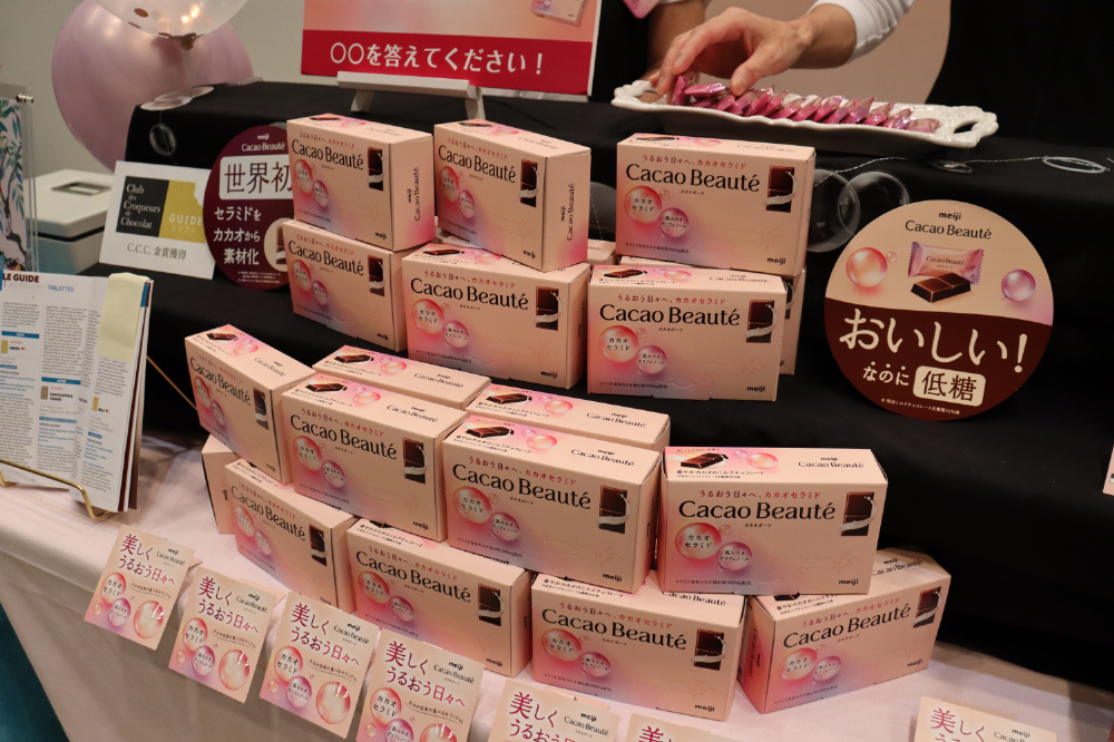 「(株)明治」では、世界で初めて※1素材化に成功したカカオハスク由来の美容サポート成分「カカオセラミド」を配合したチョコレート「カカオボーテ」を紹介。9月30日の新発売に先駆けて、TCSでのお披露目となりました。「カカオセラミド」を配合し、高カカオポリフェノール含有、さらに低糖※仕立てとのことで、チョコレートは食べたいけど美容や健康も気になる、という方に嬉しい商品です。(※明治ミルクチョコレート比 糖類40%減)