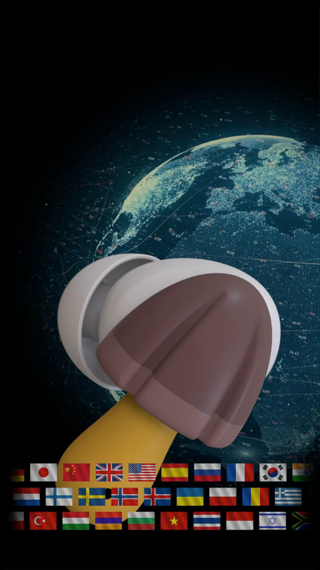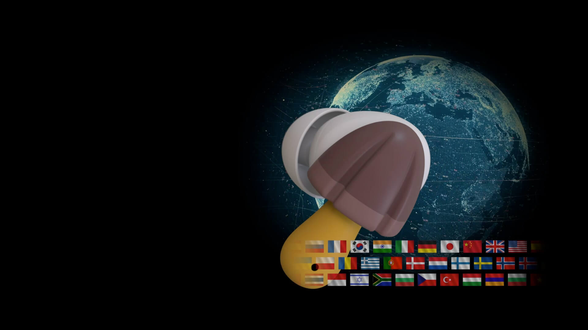 片方の「きのこの山」をパートナーに着用してもらうだけで、双方の会話がリアルタイムで翻訳されます。さまざまな国籍のビジネスパートナーと自然な会話を可能にします。操作は簡単ワンタッチ。相手の顔を見ながらコミュニケーションができます。