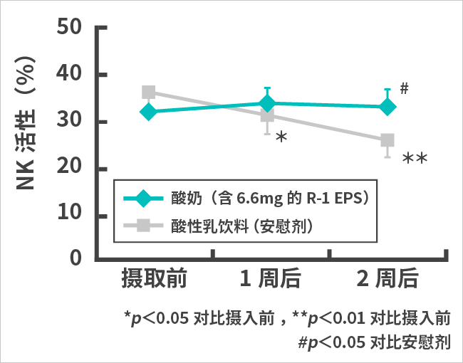 大学田径队的18名男子长跑运动员及13名男子投掷运动员,按照运动项目随机分为2组,确保在分组上没有偏差,分别摄取以乳酸菌OLL1073R-1菌株及乳酸菌OLS3059菌株发酵的酸奶组(含6.6mg的R-1 EPS)或安慰剂的酸性乳饮料2周。此期间举办为期1周的训练营,让运动员实施剧烈运动。将NK活性作为主要评价项目。