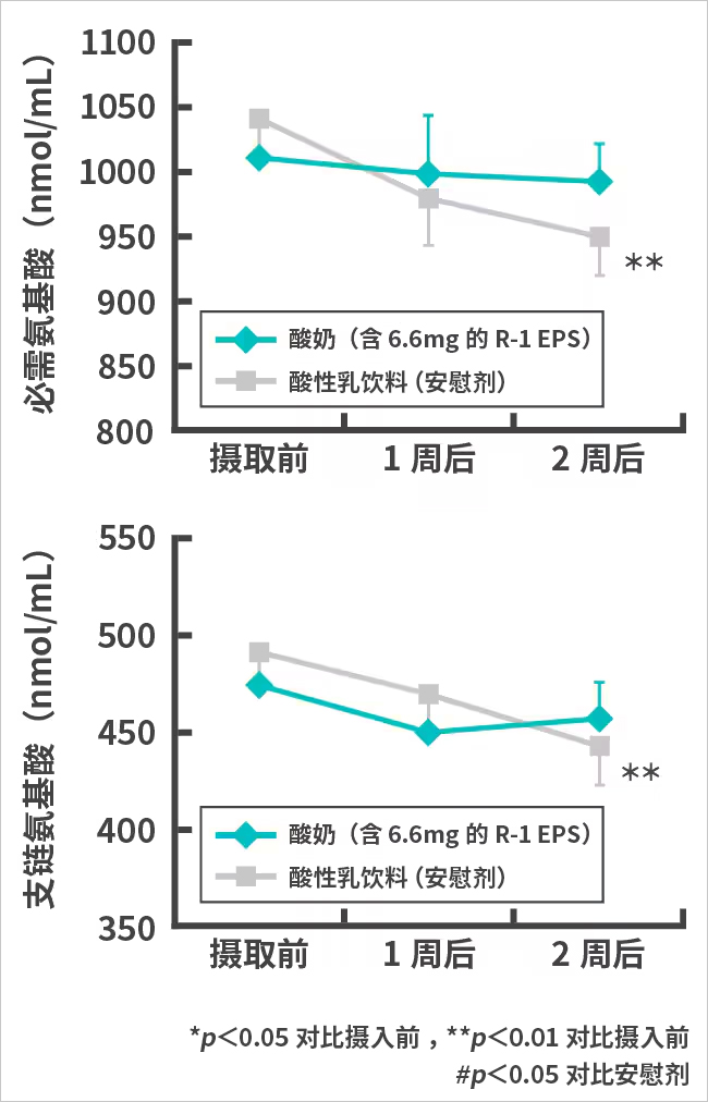 从这些结果可以证明,酸奶组通过摄取以乳酸菌OLL1073R-1菌株及乳酸菌OLS3059菌株发酵的酸奶(含6.6mg的R-1 EPS),能够抑制剧烈运动导致的暂时性免疫功能下降。此外,可以认为,该酸奶能够抑制剧烈运动造成的肠道功能下降并将血液中的氨基酸浓度维持在正常水平,以此来保持良好身体状况。
