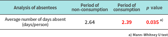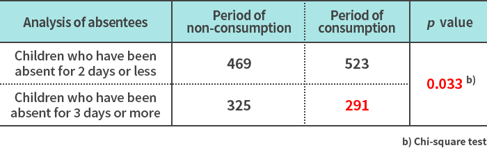 Findings from OLL1073R-1 and OLS3059 lactic acid bacteria research(7)Yogurt fermented with OLL1073R-1 and OLS3059 lactic acid bacteria has been confirmed to reduce school absenteeism and improve learning motivation in elementary school students (human study conducted in boys and girls attending 6 elementary schools in Hachioji City, Tokyo, from 2022 to 2023).This study was a non-consumption-controlled crossover study involving 2,179 boys and girls attending 6 elementary schools in Hachioji City. The effects of consuming yogurt fermented with OLL1073R-1 and OLS3059 lactic acid bacteria for 8 weeks on the number of days absent from school, motivation to learn, and interpersonal relationships were analyzed. The results suggested that consuming yogurt fermented with OLL1073R-1 and OLS3059 lactic acid bacteria may reduce symptoms in students who are absent from school.Average number of days absent (total)
