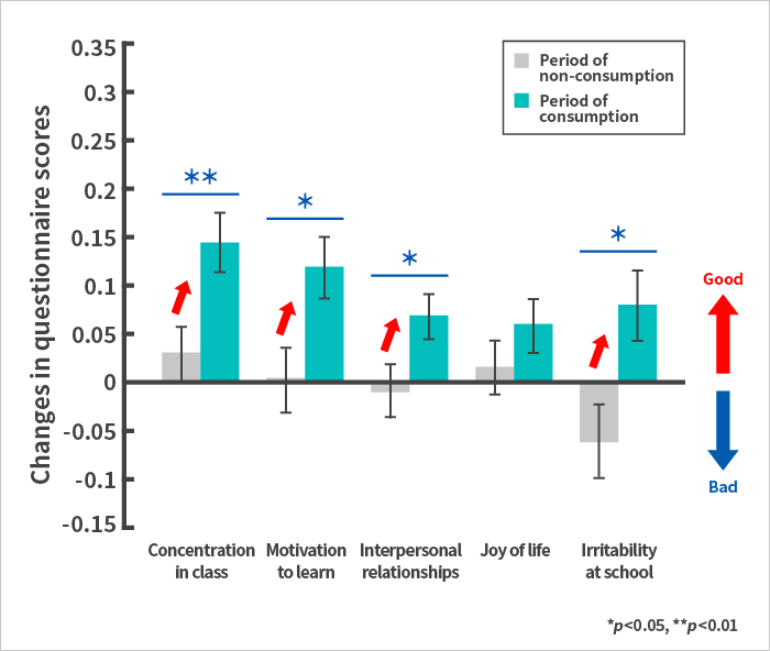Consumption of yogurt fermented with OLL1073R-1 and OLS3059 lactic acid bacteria significantly improved nasal and eye problems and chills.Results of questionnaire on physical conditions ![]() Consumption of yogurt fermented with OLL1073R-1 and OLS3059 lactic acid bacteria significantly improved concentration in class, motivation to learn, interpersonal relationships, and irritability at school.Results of questionnaire on physical conditions ![]()
