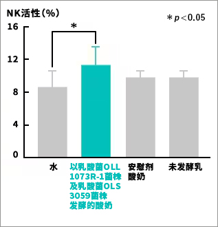 确认投喂以乳酸菌OLL1073R-1菌株及乳酸菌OLS3059菌株发酵的酸奶,可增强NK细胞活性(根据2005年实施的动物试验结果)