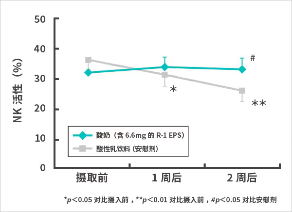 大学田径队的18名男子长跑运动员及13名男子投掷运动员,按照运动项目随机分为2组,确保在分组上没有偏差,分别摄取以乳酸菌OLL1073R-1菌株及乳酸菌OLS3059菌株发酵的酸奶组(含6.6mg的R-1 EPS)或安慰剂的酸性乳饮料2周。此期间举办为期1周的训练营,让运动员实施剧烈运动。将NK活性作为主要评价项目。