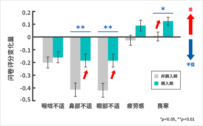 摄入以乳酸菌OLL1073R-1菌株及乳酸菌OLS3059菌株发酵的酸奶后,(有统计学意义地)显著改善了鼻部/眼部不适与畏寒症状